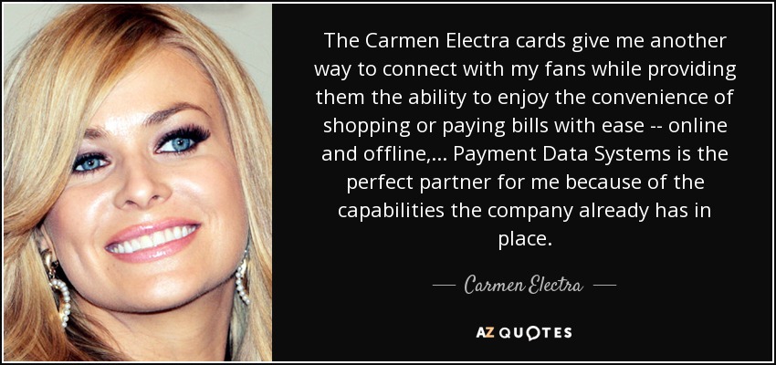 The Carmen Electra cards give me another way to connect with my fans while providing them the ability to enjoy the convenience of shopping or paying bills with ease -- online and offline, ... Payment Data Systems is the perfect partner for me because of the capabilities the company already has in place.
