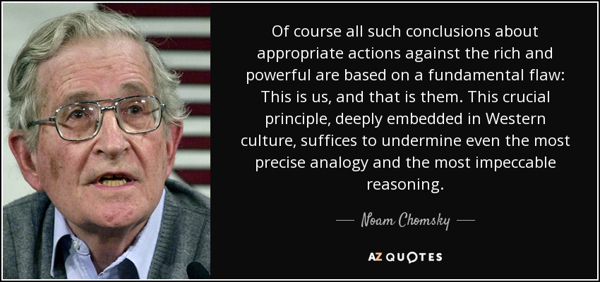 Of course all such conclusions about appropriate actions against the rich and powerful are based on a fundamental flaw: This is us, and that is them. This crucial principle, deeply embedded in Western culture, suffices to undermine even the most precise analogy and the most impeccable reasoning.