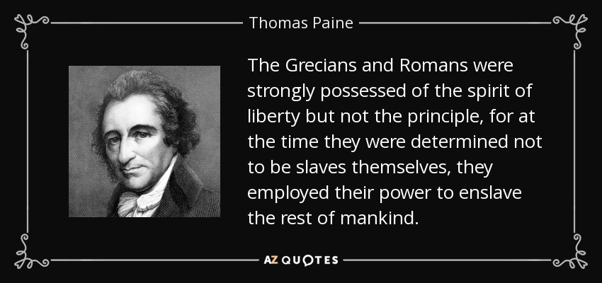 The Grecians and Romans were strongly possessed of the spirit of liberty but not the principle, for at the time they were determined not to be slaves themselves, they employed their power to enslave the rest of mankind.