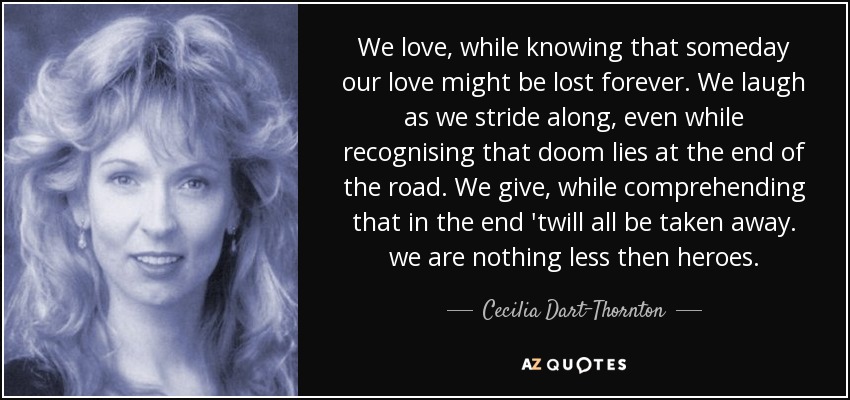We love, while knowing that someday our love might be lost forever. We laugh as we stride along, even while recognising that doom lies at the end of the road. We give, while comprehending that in the end 'twill all be taken away. we are nothing less then heroes.