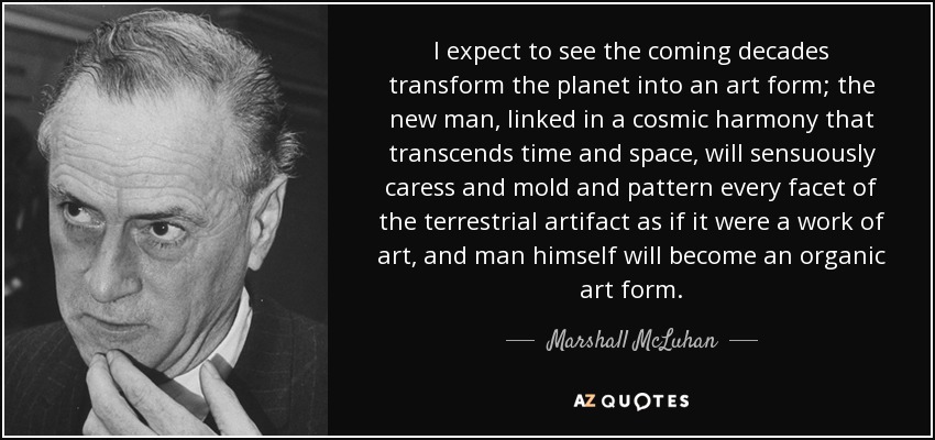 I expect to see the coming decades transform the planet into an art form; the new man, linked in a cosmic harmony that transcends time and space, will sensuously caress and mold and pattern every facet of the terrestrial artifact as if it were a work of art, and man himself will become an organic art form.