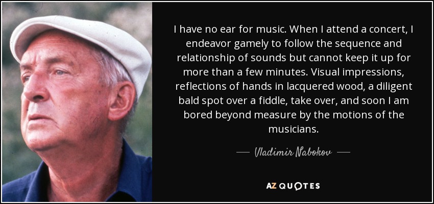 I have no ear for music. When I attend a concert, I endeavor gamely to follow the sequence and relationship of sounds but cannot keep it up for more than a few minutes. Visual impressions, reflections of hands in lacquered wood, a diligent bald spot over a fiddle, take over, and soon I am bored beyond measure by the motions of the musicians.