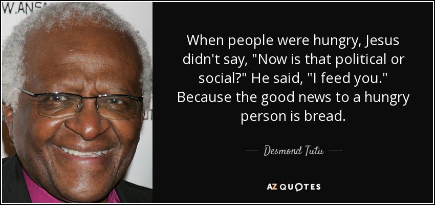 When people were hungry, Jesus didn't say, "Now is that political or social?" He said, "I feed you." Because the good news to a hungry person is bread.