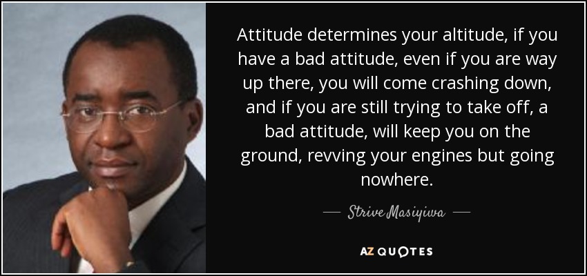 Attitude determines your altitude, if you have a bad attitude, even if you are way up there, you will come crashing down, and if you are still trying to take off, a bad attitude, will keep you on the ground, revving your engines but going nowhere.