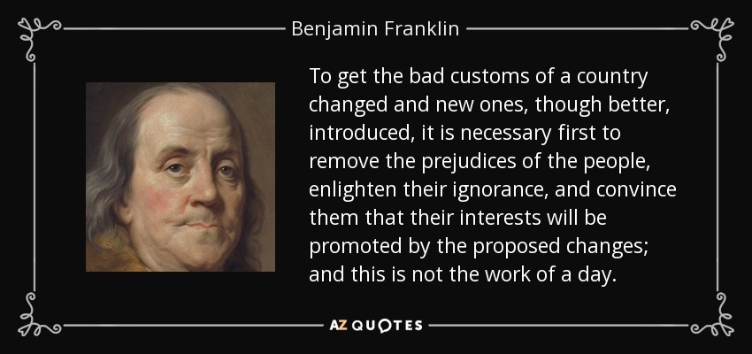To get the bad customs of a country changed and new ones, though better, introduced, it is necessary first to remove the prejudices of the people, enlighten their ignorance, and convince them that their interests will be promoted by the proposed changes; and this is not the work of a day.