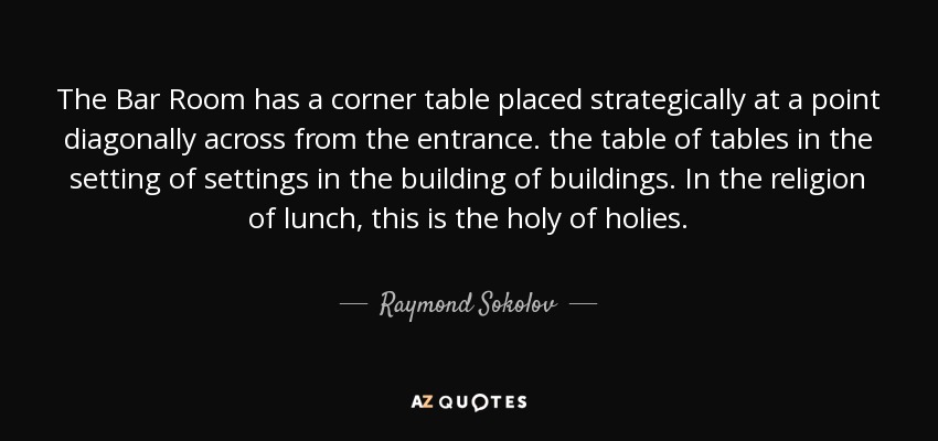 The Bar Room has a corner table placed strategically at a point diagonally across from the entrance. the table of tables in the setting of settings in the building of buildings. In the religion of lunch, this is the holy of holies.