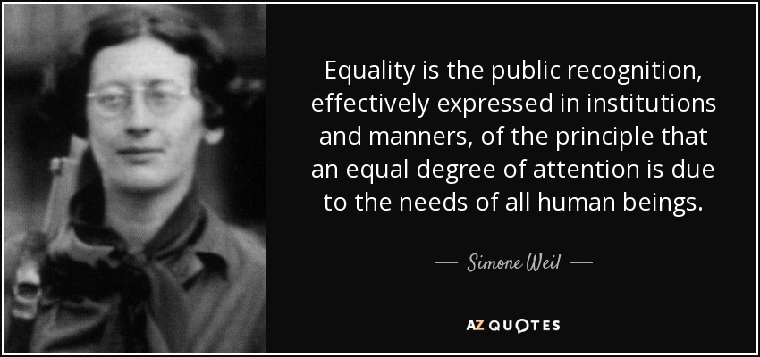 Equality is the public recognition, effectively expressed in institutions and manners, of the principle that an equal degree of attention is due to the needs of all human beings.