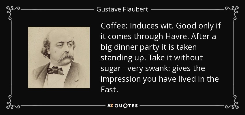 Coffee: Induces wit. Good only if it comes through Havre. After a big dinner party it is taken standing up. Take it without sugar - very swank: gives the impression you have lived in the East.