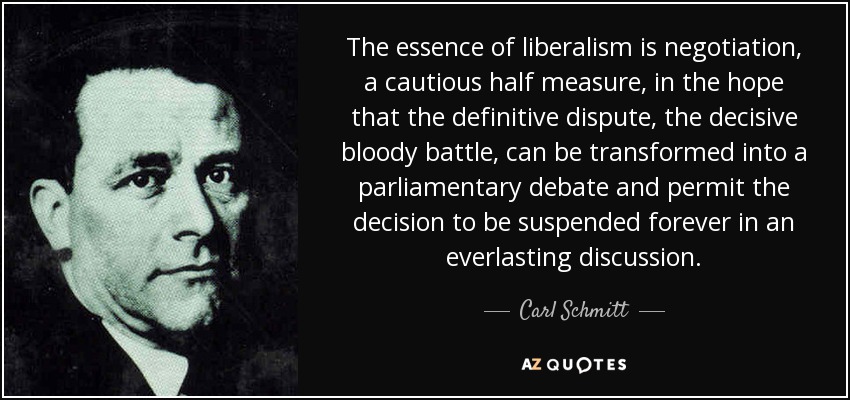 The essence of liberalism is negotiation, a cautious half measure, in the hope that the definitive dispute, the decisive bloody battle, can be transformed into a parliamentary debate and permit the decision to be suspended forever in an everlasting discussion.