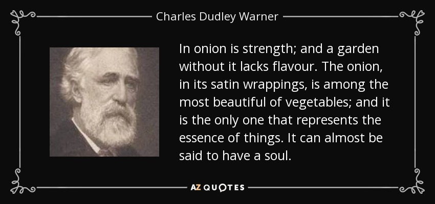 In onion is strength; and a garden without it lacks flavour. The onion, in its satin wrappings, is among the most beautiful of vegetables; and it is the only one that represents the essence of things. It can almost be said to have a soul.