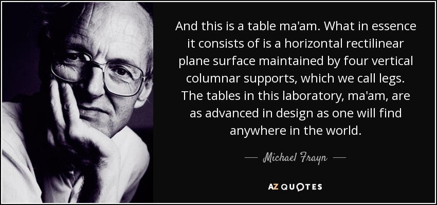 And this is a table ma'am. What in essence it consists of is a horizontal rectilinear plane surface maintained by four vertical columnar supports, which we call legs. The tables in this laboratory, ma'am, are as advanced in design as one will find anywhere in the world.