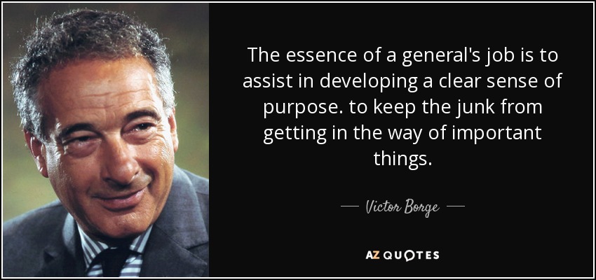 The essence of a general's job is to assist in developing a clear sense of purpose . to keep the junk from getting in the way of important things.