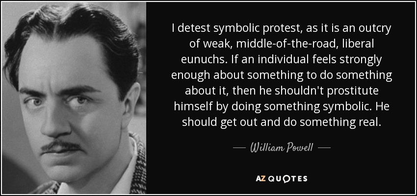 I detest symbolic protest, as it is an outcry of weak, middle-of-the-road, liberal eunuchs. If an individual feels strongly enough about something to do something about it, then he shouldn't prostitute himself by doing something symbolic. He should get out and do something real.