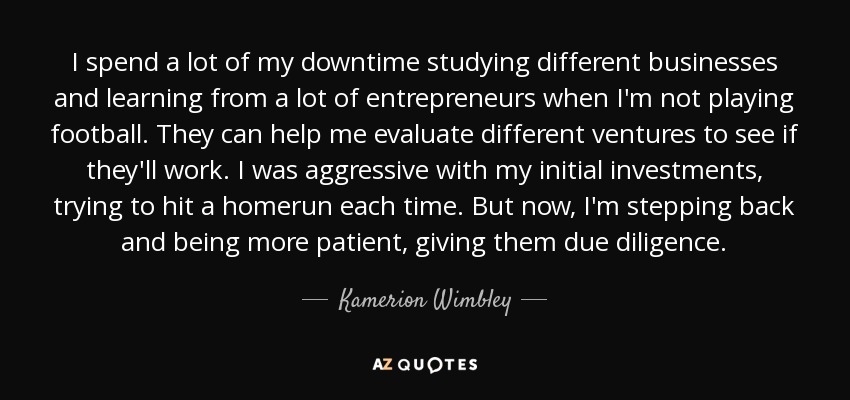 I spend a lot of my downtime studying different businesses and learning from a lot of entrepreneurs when I'm not playing football. They can help me evaluate different ventures to see if they'll work. I was aggressive with my initial investments, trying to hit a homerun each time. But now, I'm stepping back and being more patient, giving them due diligence.