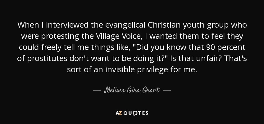 When I interviewed the evangelical Christian youth group who were protesting the Village Voice, I wanted them to feel they could freely tell me things like, "Did you know that 90 percent of prostitutes don't want to be doing it?" Is that unfair? That's sort of an invisible privilege for me.