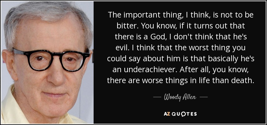 The important thing, I think, is not to be bitter. You know, if it turns out that there is a God, I don't think that he's evil. I think that the worst thing you could say about him is that basically he's an underachiever. After all, you know, there are worse things in life than death.