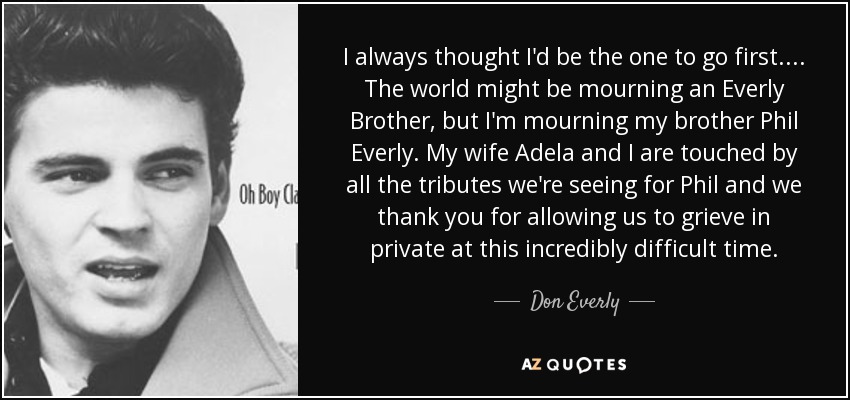 I always thought I'd be the one to go first. ... The world might be mourning an Everly Brother, but I'm mourning my brother Phil Everly. My wife Adela and I are touched by all the tributes we're seeing for Phil and we thank you for allowing us to grieve in private at this incredibly difficult time.