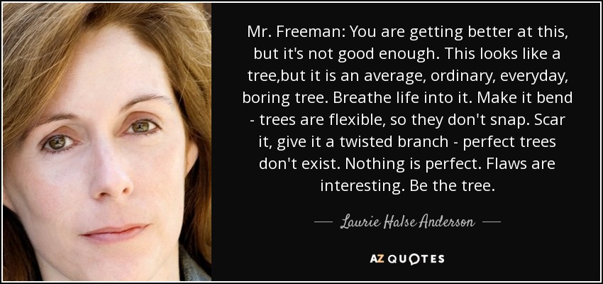 Mr. Freeman: You are getting better at this, but it's not good enough. This looks like a tree,but it is an average, ordinary, everyday, boring tree. Breathe life into it. Make it bend - trees are flexible, so they don't snap. Scar it, give it a twisted branch - perfect trees don't exist. Nothing is perfect. Flaws are interesting. Be the tree.