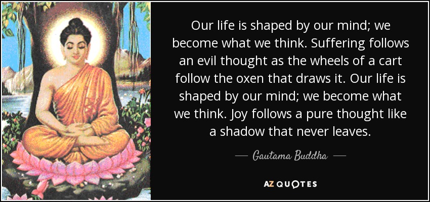 Our life is shaped by our mind; we become what we think. Suffering follows an evil thought as the wheels of a cart follow the oxen that draws it. Our life is shaped by our mind; we become what we think. Joy follows a pure thought like a shadow that never leaves.