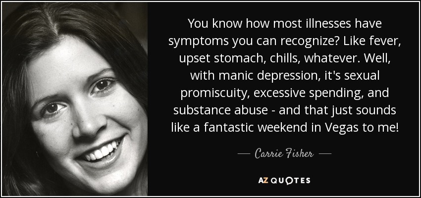 You know how most illnesses have symptoms you can recognize? Like fever, upset stomach, chills, whatever. Well, with manic depression, it's sexual promiscuity, excessive spending, and substance abuse - and that just sounds like a fantastic weekend in Vegas to me!