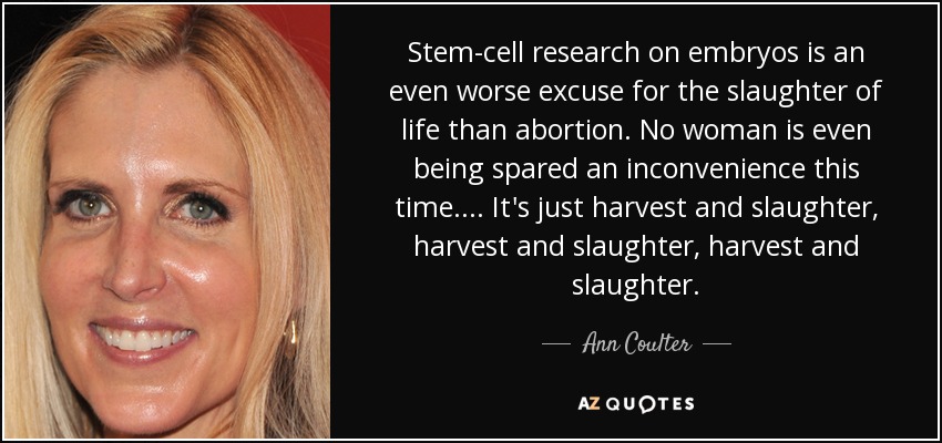 Stem-cell research on embryos is an even worse excuse for the slaughter of life than abortion. No woman is even being spared an inconvenience this time.... It's just harvest and slaughter, harvest and slaughter, harvest and slaughter.