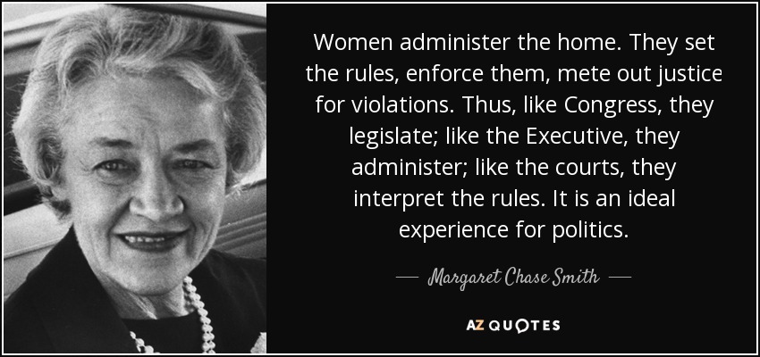 Women administer the home. They set the rules, enforce them, mete out justice for violations. Thus, like Congress, they legislate; like the Executive, they administer; like the courts, they interpret the rules. It is an ideal experience for politics.