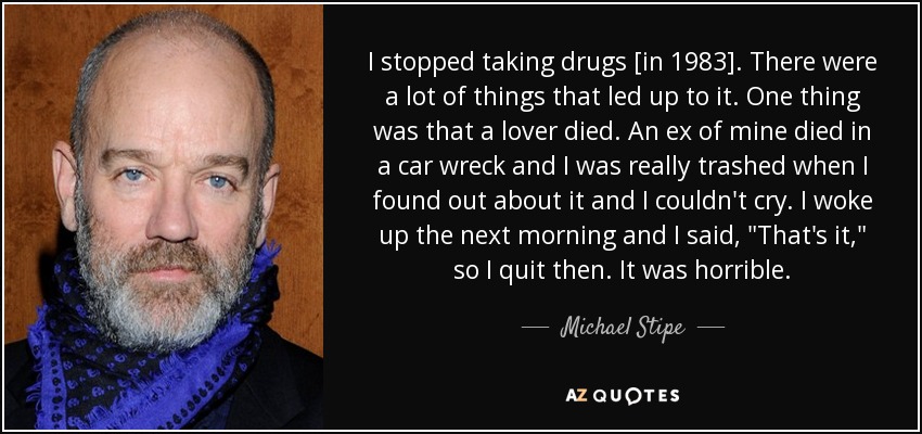 I stopped taking drugs [in 1983]. There were a lot of things that led up to it. One thing was that a lover died. An ex of mine died in a car wreck and I was really trashed when I found out about it and I couldn't cry. I woke up the next morning and I said, "That's it," so I quit then. It was horrible.