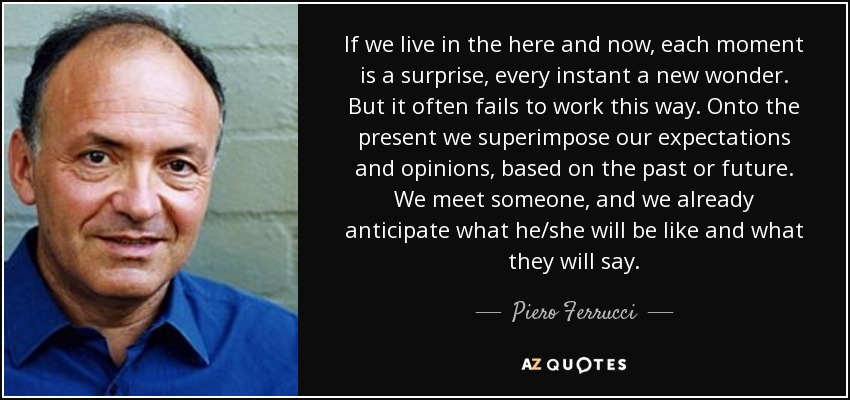If we live in the here and now, each moment is a surprise, every instant a new wonder. But it often fails to work this way. Onto the present we superimpose our expectations and opinions, based on the past or future. We meet someone, and we already anticipate what he/she will be like and what they will say.