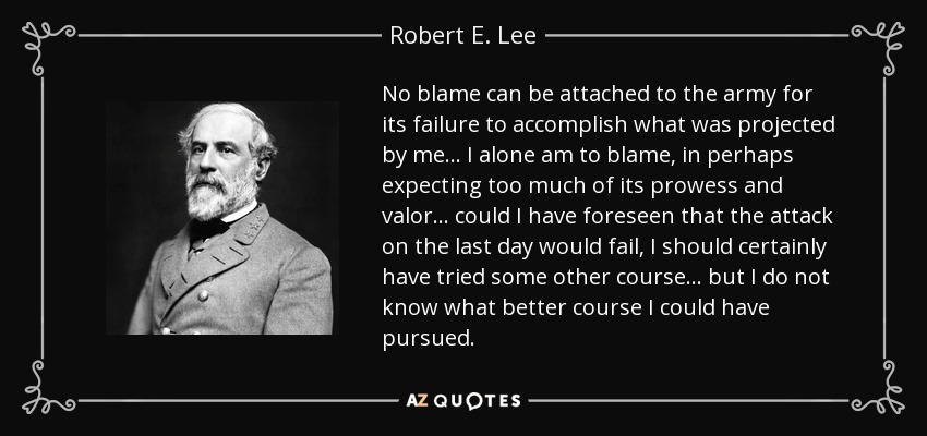 No blame can be attached to the army for its failure to accomplish what was projected by me... I alone am to blame, in perhaps expecting too much of its prowess and valor... could I have foreseen that the attack on the last day would fail, I should certainly have tried some other course... but I do not know what better course I could have pursued.