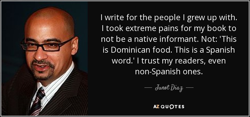I write for the people I grew up with. I took extreme pains for my book to not be a native informant. Not: 'This is Dominican food. This is a Spanish word.' I trust my readers, even non-Spanish ones.