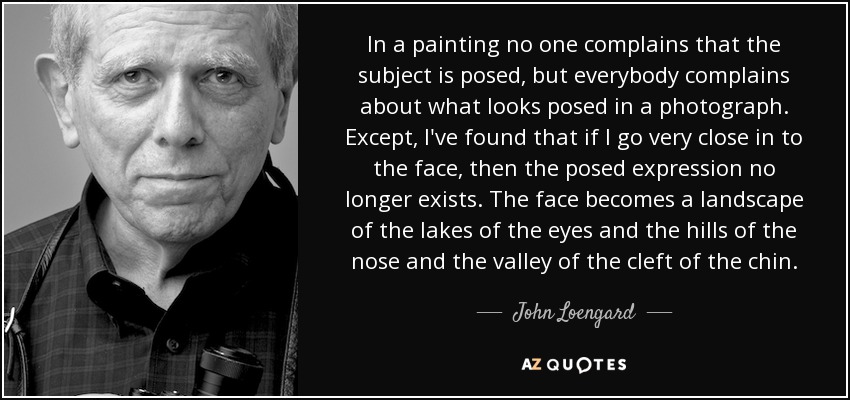 In a painting no one complains that the subject is posed, but everybody complains about what looks posed in a photograph. Except, I've found that if I go very close in to the face, then the posed expression no longer exists. The face becomes a landscape of the lakes of the eyes and the hills of the nose and the valley of the cleft of the chin.