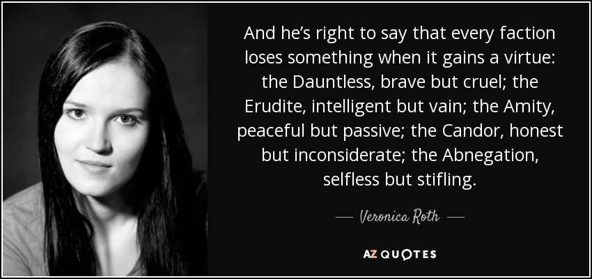 And he’s right to say that every faction loses something when it gains a virtue: the Dauntless, brave but cruel; the Erudite, intelligent but vain; the Amity, peaceful but passive; the Candor, honest but inconsiderate; the Abnegation, selfless but stifling.
