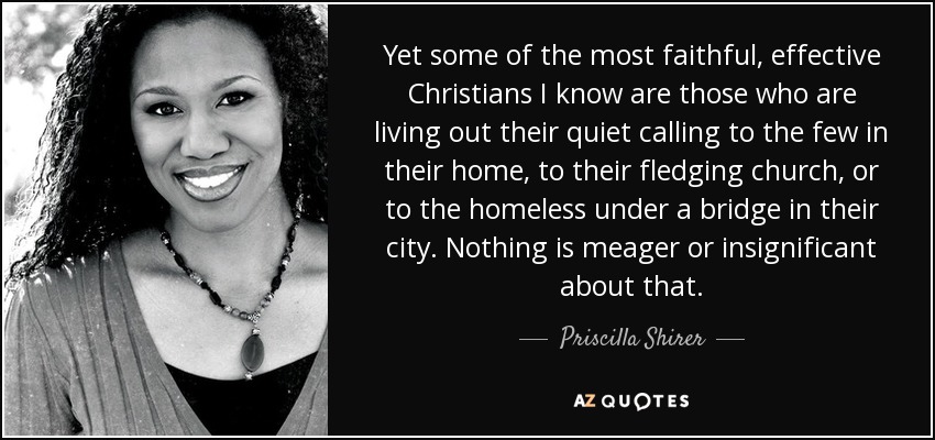 Yet some of the most faithful, effective Christians I know are those who are living out their quiet calling to the few in their home, to their fledging church, or to the homeless under a bridge in their city. Nothing is meager or insignificant about that.