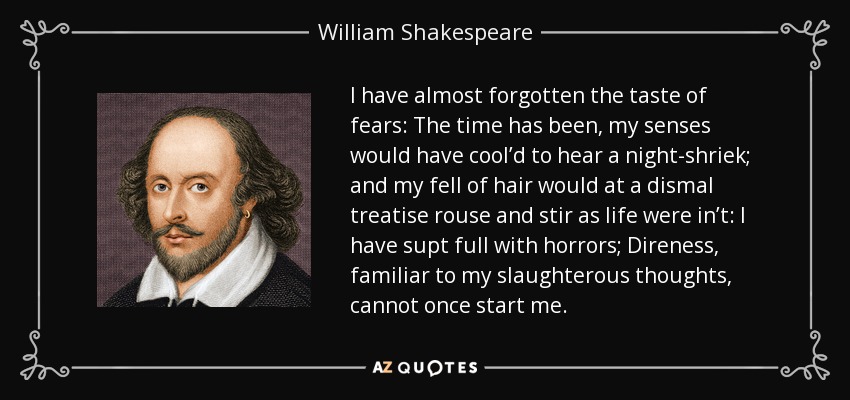 I have almost forgotten the taste of fears: The time has been, my senses would have cool’d to hear a night-shriek; and my fell of hair would at a dismal treatise rouse and stir as life were in’t: I have supt full with horrors; Direness, familiar to my slaughterous thoughts, cannot once start me.