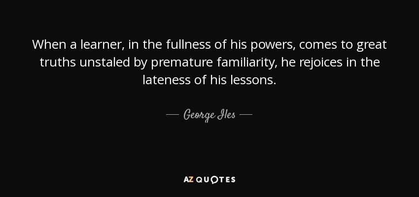 When a learner, in the fullness of his powers, comes to great truths unstaled by premature familiarity, he rejoices in the lateness of his lessons.