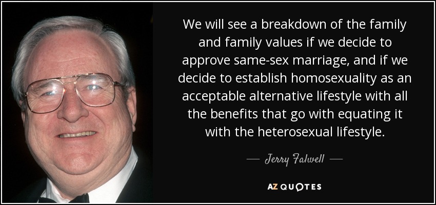 We will see a breakdown of the family and family values if we decide to approve same-sex marriage, and if we decide to establish homosexuality as an acceptable alternative lifestyle with all the benefits that go with equating it with the heterosexual lifestyle.
