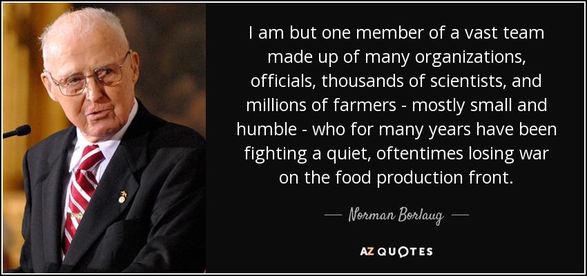 I am but one member of a vast team made up of many organizations, officials, thousands of scientists, and millions of farmers - mostly small and humble - who for many years have been fighting a quiet, oftentimes losing war on the food production front.