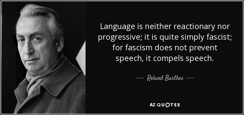 Language is neither reactionary nor progressive; it is quite simply fascist; for fascism does not prevent speech, it compels speech.