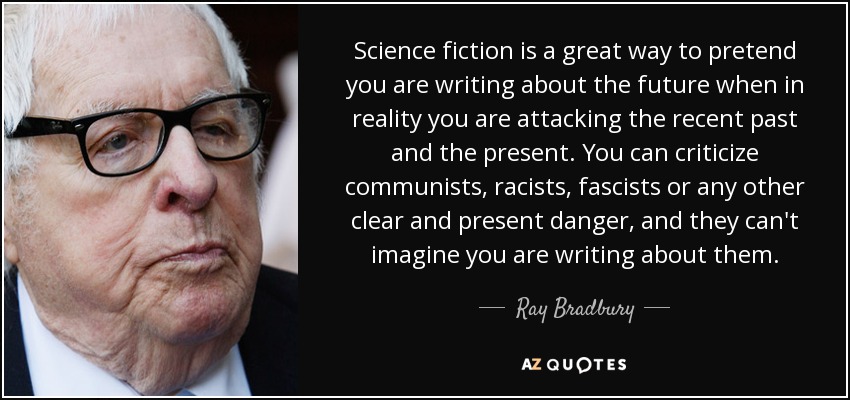 Science fiction is a great way to pretend you are writing about the future when in reality you are attacking the recent past and the present. You can criticize communists, racists, fascists or any other clear and present danger, and they can't imagine you are writing about them.