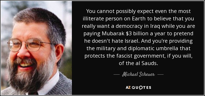 You cannot possibly expect even the most illiterate person on Earth to believe that you really want a democracy in Iraq while you are paying Mubarak $3 billion a year to pretend he doesn't hate Israel. And you're providing the military and diplomatic umbrella that protects the fascist government, if you will, of the al Sauds.