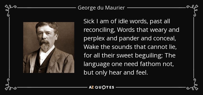 Sick I am of idle words, past all reconciling, Words that weary and perplex and pander and conceal, Wake the sounds that cannot lie, for all their sweet beguiling; The language one need fathom not, but only hear and feel.