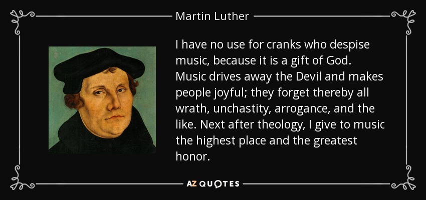 I have no use for cranks who despise music, because it is a gift of God. Music drives away the Devil and makes people joyful; they forget thereby all wrath, unchastity, arrogance, and the like. Next after theology, I give to music the highest place and the greatest honor.