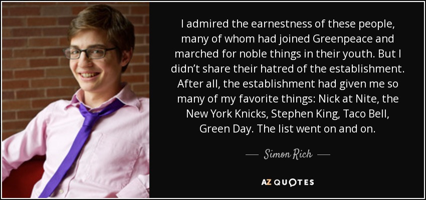 I admired the earnestness of these people, many of whom had joined Greenpeace and marched for noble things in their youth. But I didn’t share their hatred of the establishment. After all, the establishment had given me so many of my favorite things: Nick at Nite, the New York Knicks, Stephen King, Taco Bell, Green Day. The list went on and on.