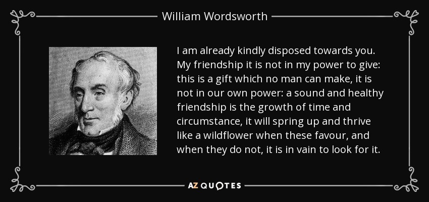 I am already kindly disposed towards you. My friendship it is not in my power to give: this is a gift which no man can make, it is not in our own power: a sound and healthy friendship is the growth of time and circumstance, it will spring up and thrive like a wildflower when these favour, and when they do not, it is in vain to look for it.