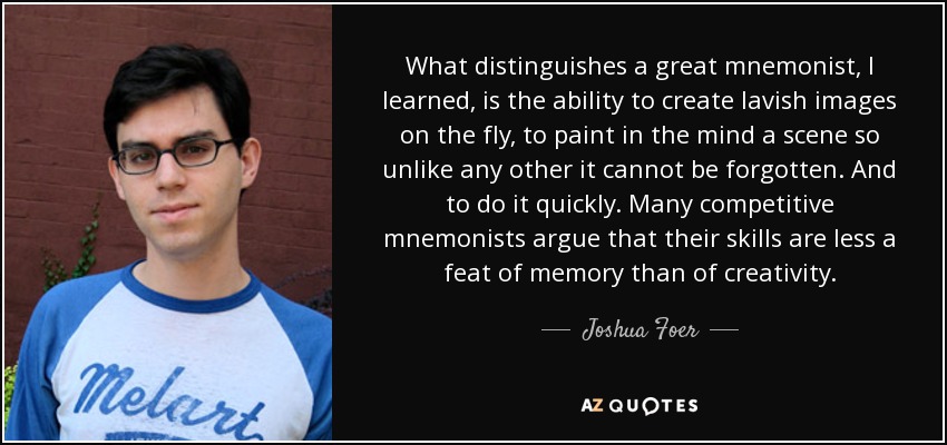 What distinguishes a great mnemonist, I learned, is the ability to create lavish images on the fly, to paint in the mind a scene so unlike any other it cannot be forgotten. And to do it quickly. Many competitive mnemonists argue that their skills are less a feat of memory than of creativity.