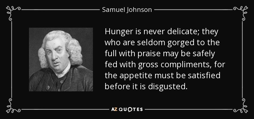 Hunger is never delicate; they who are seldom gorged to the full with praise may be safely fed with gross compliments, for the appetite must be satisfied before it is disgusted.