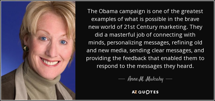 The Obama campaign is one of the greatest examples of what is possible in the brave new world of 21st Century marketing. They did a masterful job of connecting with minds, personalizing messages, refining old and new media, sending clear messages, and providing the feedback that enabled them to respond to the messages they heard.