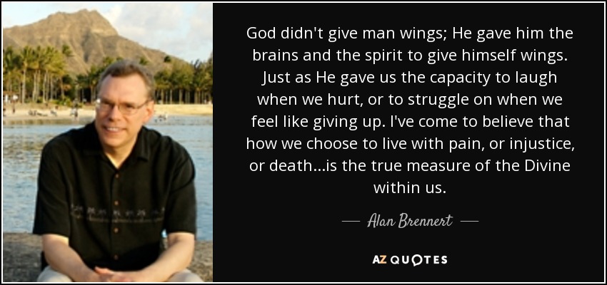 God didn't give man wings; He gave him the brains and the spirit to give himself wings. Just as He gave us the capacity to laugh when we hurt, or to struggle on when we feel like giving up. I've come to believe that how we choose to live with pain, or injustice, or death...is the true measure of the Divine within us.