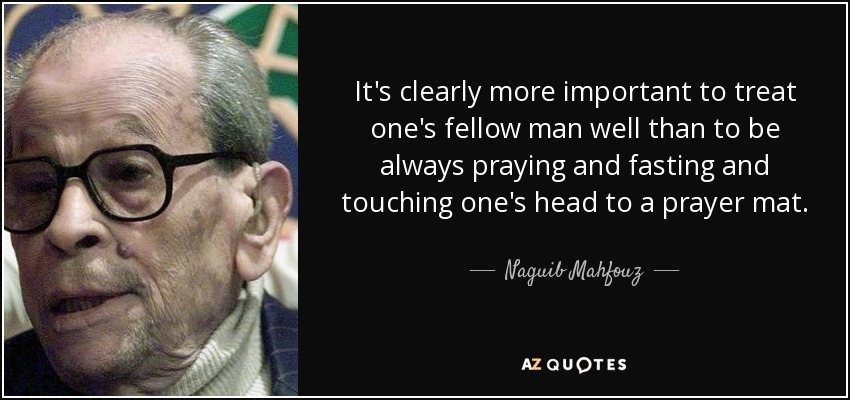 It's clearly more important to treat one's fellow man well than to be always praying and fasting and touching one's head to a prayer mat.