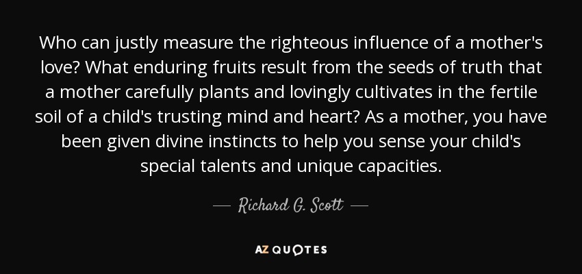 Who can justly measure the righteous influence of a mother's love? What enduring fruits result from the seeds of truth that a mother carefully plants and lovingly cultivates in the fertile soil of a child's trusting mind and heart? As a mother, you have been given divine instincts to help you sense your child's special talents and unique capacities.